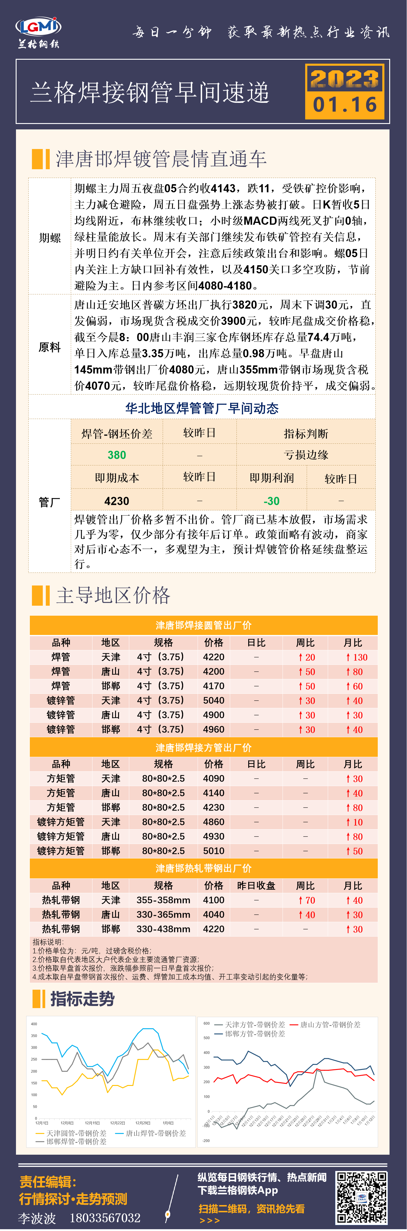 1月16日(9:20)兰格津唐邯焊接钢管早间速递