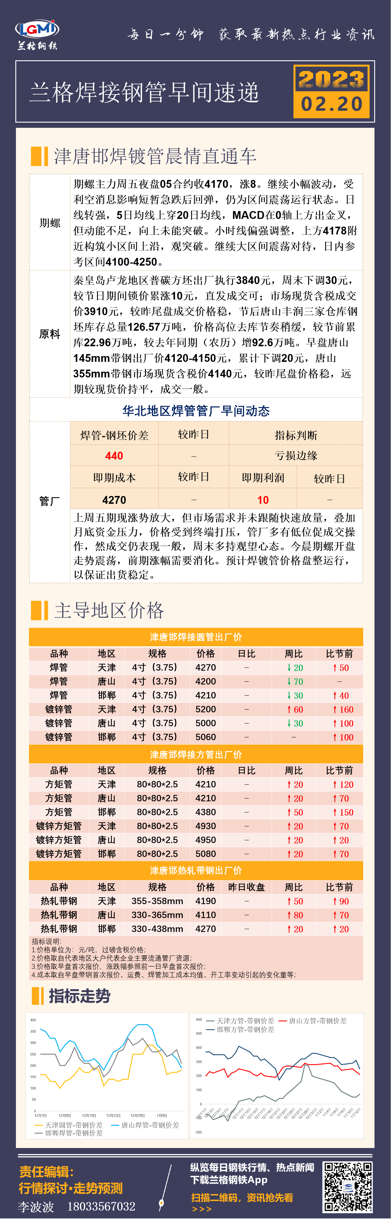 2月20日(9:20)兰格津唐邯焊接钢管早间速递