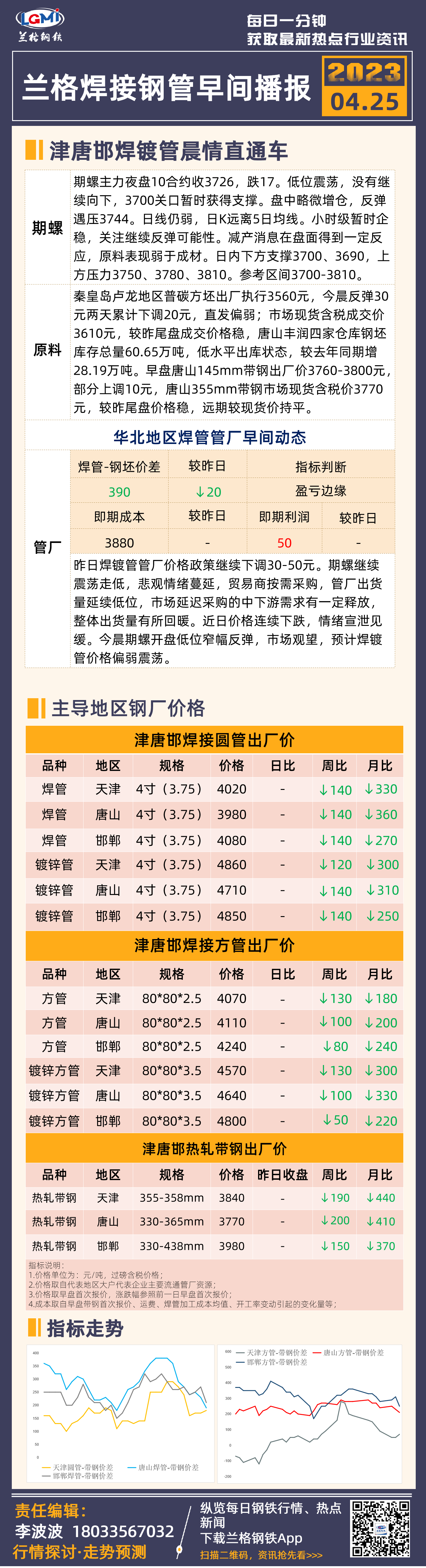 4月25日(9:20)兰格津唐邯焊接钢管早间速递