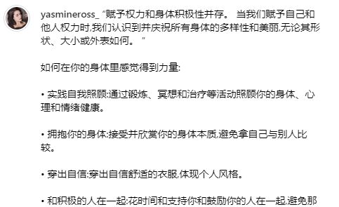 此外,她还分享了让自己变得更有力量的小技巧,比如锻炼身体,不去和别人比较,穿出自信,与积极的人在一起,或是参加自己喜欢的活动等等。其积极的生活态度,获得了很多网友的赞赏。