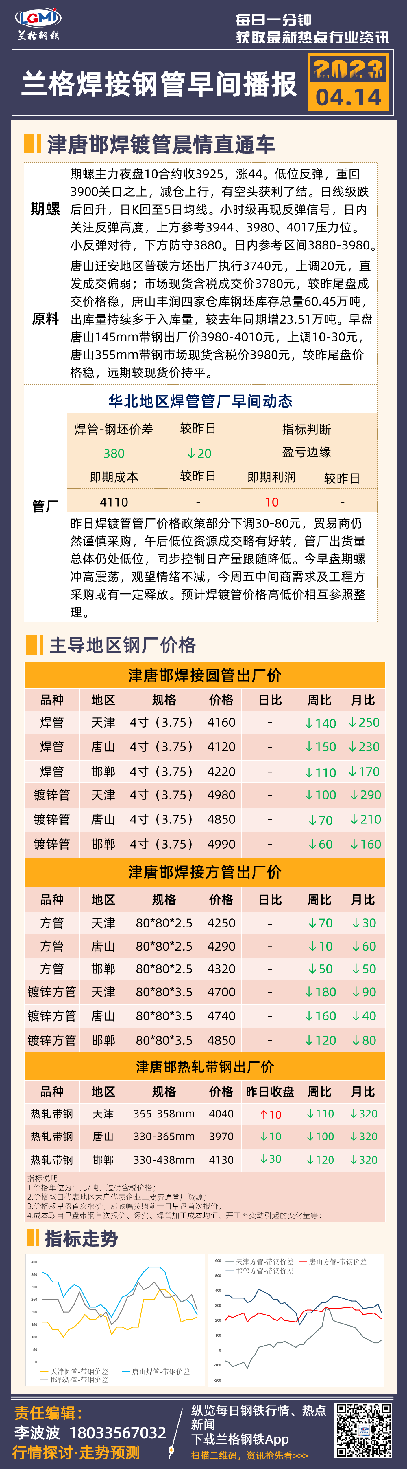 4月14日(9:20)兰格津唐邯焊接钢管早间速递