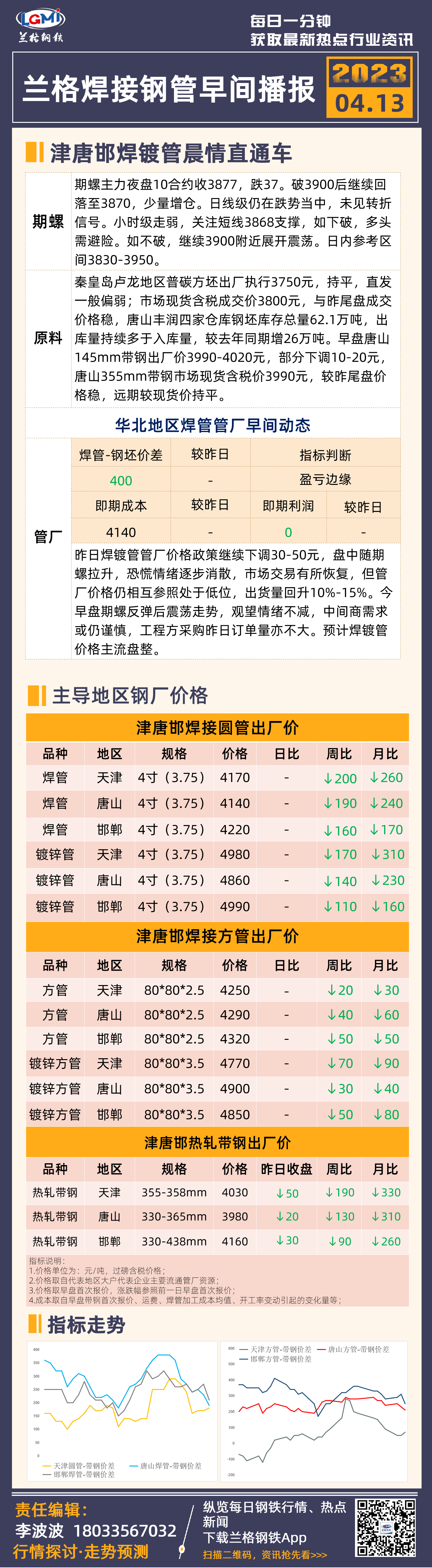 4月13日(9:20)兰格津唐邯焊接钢管早间速递