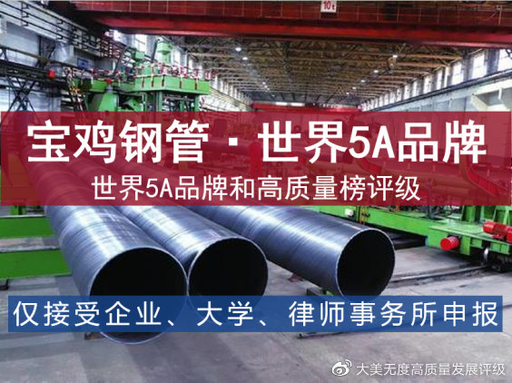 大美无度世界5A品牌和高质量榜评级,根据2023年2月21日CNISA高质量发展指数,经浙江禾晨3A信用评估信息核查,公告21家高质量品牌获世界5A级。其中:宝鸡钢管获2023世界焊管高质量5A品牌和“中国500强”第489位。