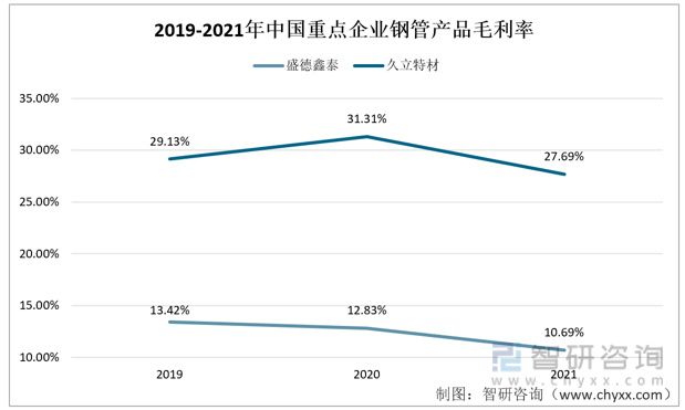 从2019-2021年中国重点企业钢管产品毛利率来看,盛德鑫泰产品毛利率处于逐年下降的状态,久立特材产品毛利率在2020年有所上涨,但在2021年间有所下跌。2021年,盛德鑫泰与久立特材钢管产品毛利率为10.69%、27.69%,同比变化率为-16.68%、-11.55%。两家企业毛利率差异大主要是由于久立特材深耕于高端市场。