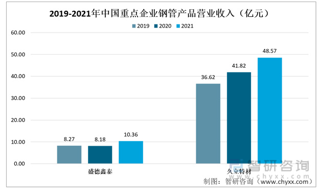从近三年中国重点企业钢管产品营业收入来看,久立特材的钢管产品营业收入呈现逐年上涨的态势,盛德鑫泰除2020年有小幅下降外,整体仍呈现上升趋势。2021年,盛德鑫泰与久立特材钢管产品营业收入分别为10.36亿元、48.57亿元,同比增加26.69%、16.16%。
