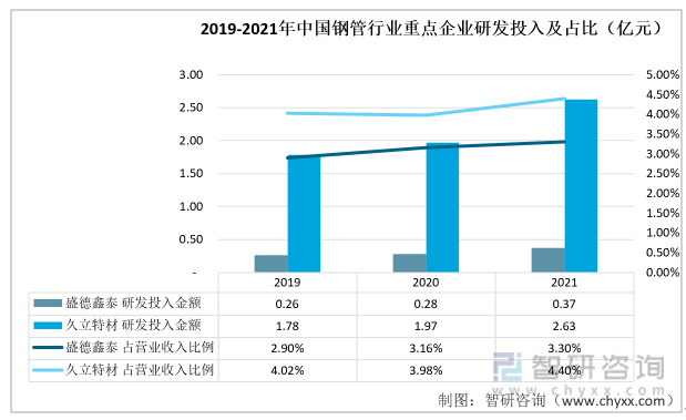 2019-2021年中国钢管行业重点企业研发投入金额及占比(亿元)