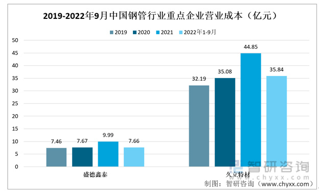 2021年,盛德鑫泰、久立特材的营业成本分别为9.99亿元、44.85亿元,同比变化率分别为30.25%、27.85%。2022年1-9月,两家企业的营业成本分别为7.66亿元、35.84亿元,同比变化率分别为6.7%、7.49%。