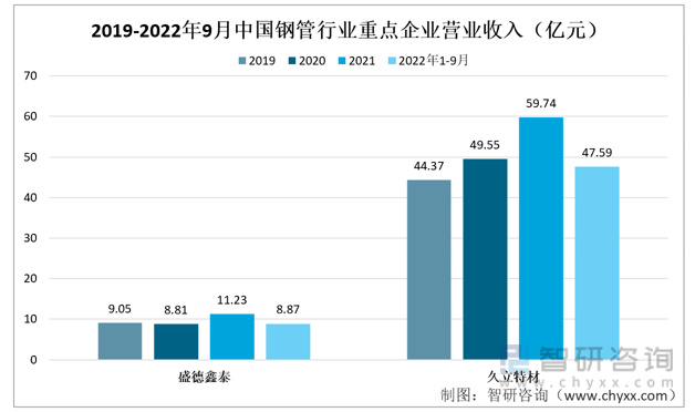 从2019-2022年9月中国钢管行业重点企业营业收入来看,久立特材比盛德鑫泰营业收入更高,两家企业的业收入大致呈上涨态势。2021年,盛德鑫泰与久立特材营业收入分别为11.23亿元、59.74亿元、,同比变化率分别为27.47%、20.57%。2022年1-9月,盛德鑫泰与久立特材营业收入分别为8.87亿元、47.59亿元,同比变化率分别为8.64%、5.91%。