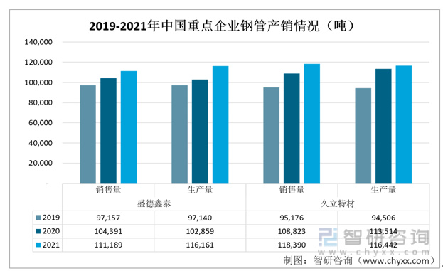 盛德鑫泰与久立特材两家企业的钢管生产量与销售量均在2019-2021年期间逐年增加,这展示了钢管行业不断向上发展的态势。2021年,盛德鑫泰的钢管销售量为111189吨,生产量为116161吨;久立特材的钢管销售量为118390吨,生产量为116442吨。