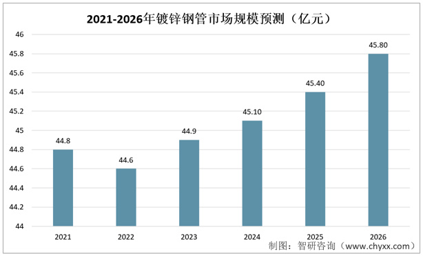 钢管需求与城镇化息息相关,新城市、城镇的建设的前期与工程机械、钢结构相关,而伴随城市的建设,给排水、供气等对管道的需求逐渐出现。根据国家统计局数据,2021年我国城镇化率为64.72%,距离日本、韩国80%以上的城镇化率仍有距离,我们预期随着城镇化率的上升,我国钢管需求仍将持续增长。根据预测,我国镀锌钢管市场规模在2021-2026年期间将整体呈现上涨趋势,2026年镀锌钢管市场规模将达到45.8亿元。