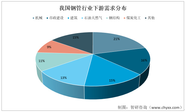 钢管的用途较为广泛,目前,中国钢管行业下游需求主要集中在机械、能源建筑领域。根据数据显示,2021年,中国建筑领域消费钢管15%,机械行业占比21%,巿政建设(包含城巿水暖、交通运输、港口、护栏、地下管廊等)占比16%。