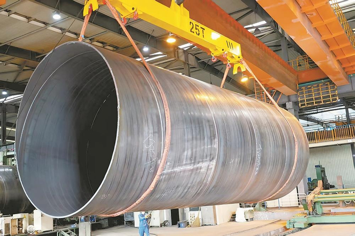 据了解,本次下线的产品采用螺旋缝埋弧焊工艺,长度可在8至10米间灵活定制,相较于常规三辊直缝焊管工艺,其生产效率提升超过4倍。此类钢管可广泛应用于市政给排水、桥梁工程桩基、风电塔筒、人工岛围堰等重大工程领域。(陈欢欢 李宁伟 摄影报道)